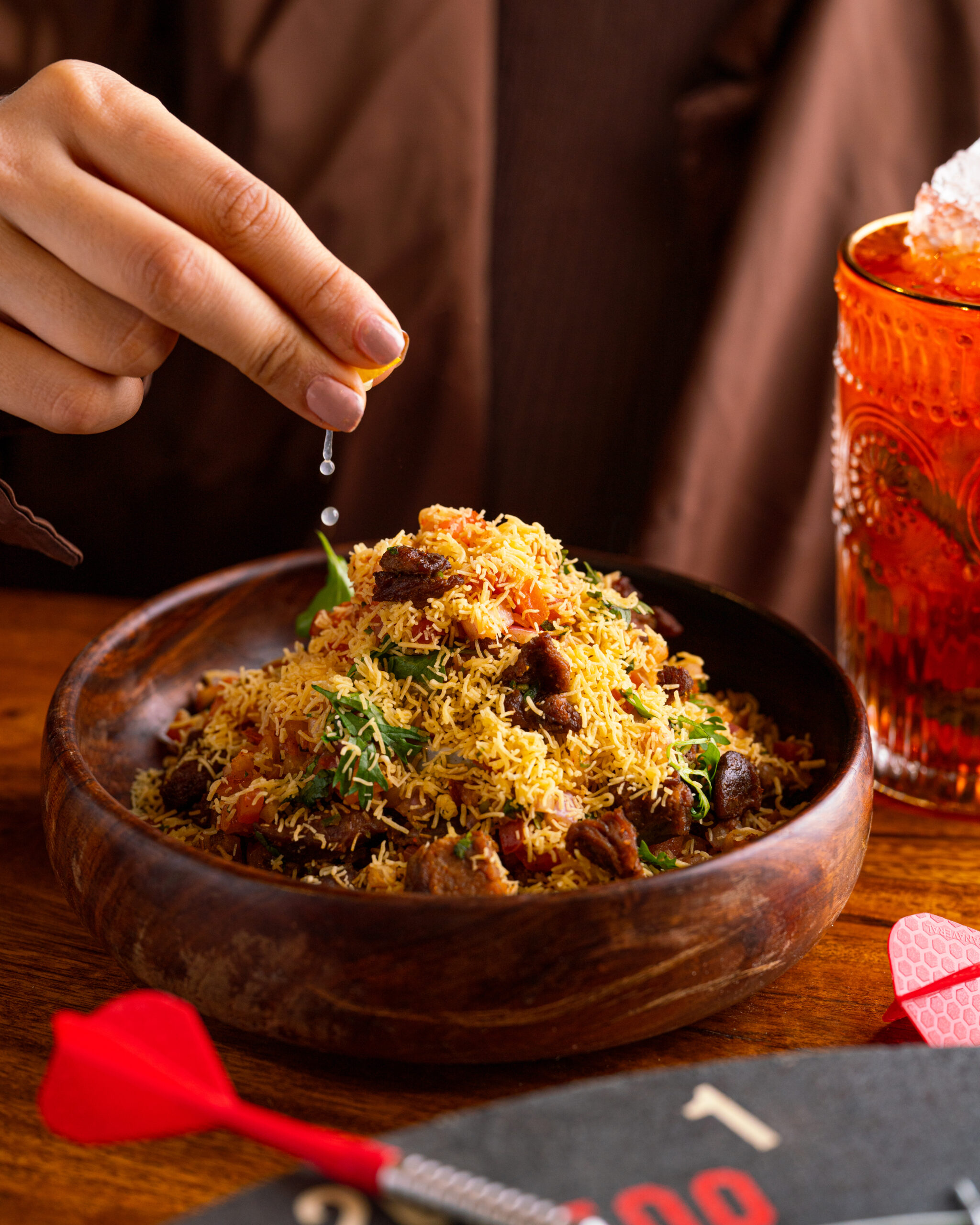 A fusion dish combining the Indian street food classic, Bhel Puri, with the Canadian favorite, Poutine, featuring crispy fries topped with chutneys, and garnished with cilantro and cheese curds.